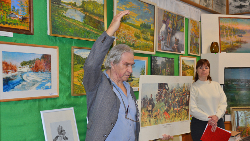 Об особенностях, о талантах мастеров аткарской палитры ребятам рассказали директор краеведческого музея Елена Натобидзе, старший научный сотрудник музея, доцент Владимир Рыжов и известный в Аткарске живописец Петр Трущелев. Конечно же, история живописи нашего края тесно связана с именем Алексея Павловича Бубнова и его легендарным полотном «Утро на Куликовом поле». Петр Алексеевич рассказал гостям о необычных фактах, связанных с картиной. Например, некоторые персонажи на полотне — образы реальных людей. С одним из них Петр Алексеевич был знаком лично. Это Евгений Тимофеев — именно его Бубнов изобразил в первом ряду русских ратников в кольчуге и с боевым топором в руке, бросающим орлиный взгляд в сторону мамаевых полков.