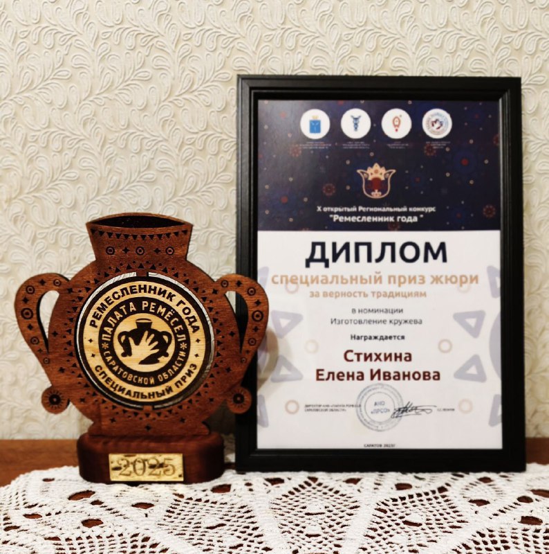 Педагог представила на конкурс скатерть «Аткарские розы», связанную крючком в технике филейного вязания. Елену Ивановну наградили за ювелирную работу специальным призом жюри «За верность традициям» в номинации «Изготовление кружева».