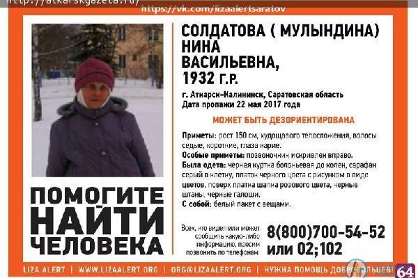Поисковый отряд Лиза Алерт Саратов разыскивает Солдатову (Мулындину) Нину Васильевну, 1932 г.р. Как сообщают волонтеры поискового отряда в официальной группе ВКонтакте, женщина исчезла 22 мая между городами Аткарск и Калининск. Приметы пенсионерки: рост 150 см, худощавого телосложения, волосы седые короткие, глаза карие. Особые приметы: позвоночник искривлен вправо.