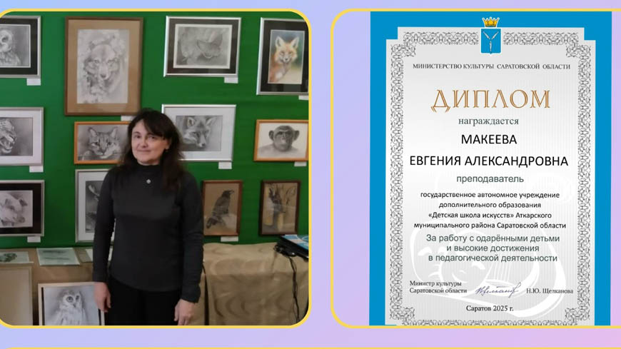 Заведующую отделением изобразительного искусства Детской школы искусств Аткарска Евгению Макееву отметили дипломом министерства культуры Саратовской области. Аткарского педагога наградили за работу с одаренными детьми и высокие достижения в педагогической деятельности.