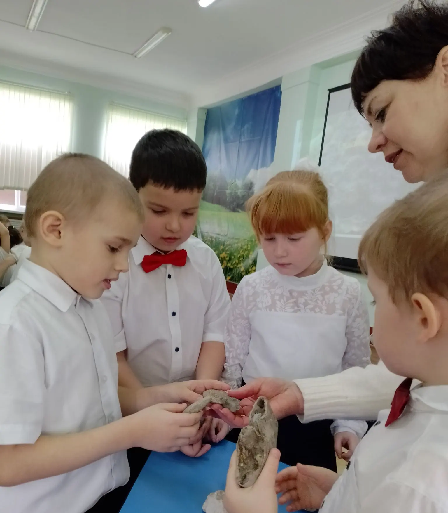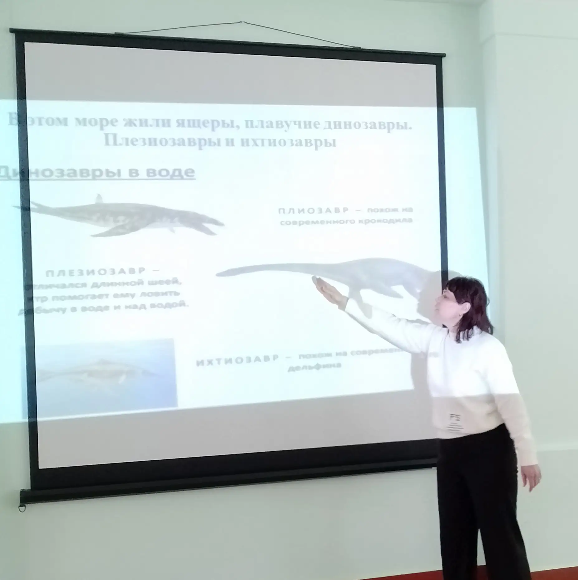 Ребята узнали, что территория нашего края в древности находилась на дне теплого и мелководного моря. Просторы этого древнего моря бороздили вымершие животные — ластообразные плезиозавры и рыбоящеры ихтиозавры, напоминавшие современных дельфинов. Малыши увидели настоящие окаменелости моллюсков белемнитов и аммонитов, смогли подержать в руках эти необычные находки. Они были в восторге от этих экспонатов.