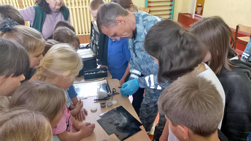 Как правильно обороняться ребятам показывают командир отделения ППС Владимир Каскевич и Антон Кулаков. Вместе с техником криминалистом прапорщиком полиции Валерием Копенкиным школьники изымают пылевой след и учатся снимать отпечатки пальцев. А вот то, что собака не только друг человека, но и верный напарник в службе ребятам демонстрирует инспектор-кинолог Вячеслав Яркин и его служебные собаки.