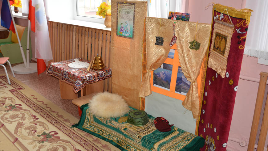 На мероприятии украшением семинара стали школьницы в нарядах русского, чувашского, казахского и азербайджанского народов. В стенах детсада «Сказка» развернули три этнических уголка – русская, дагестанская и казахская избы.