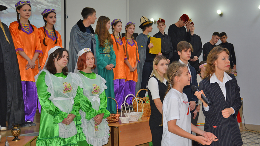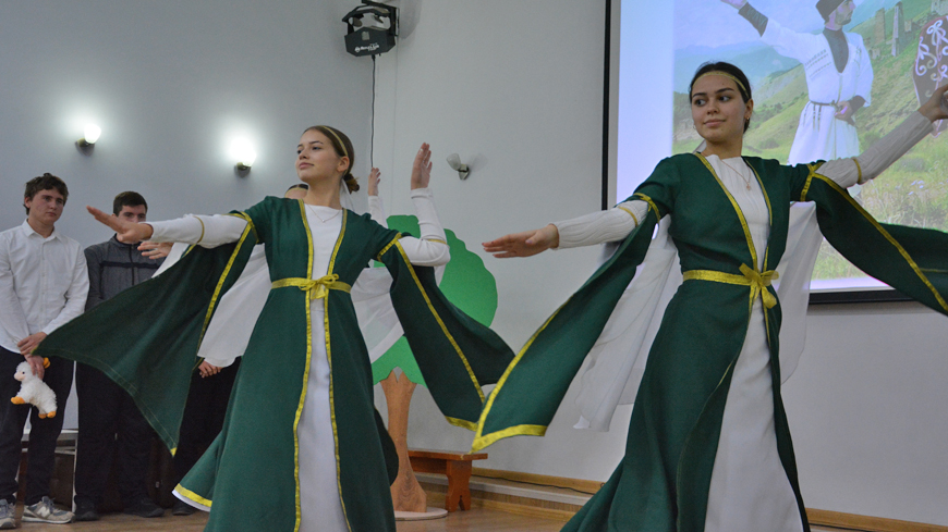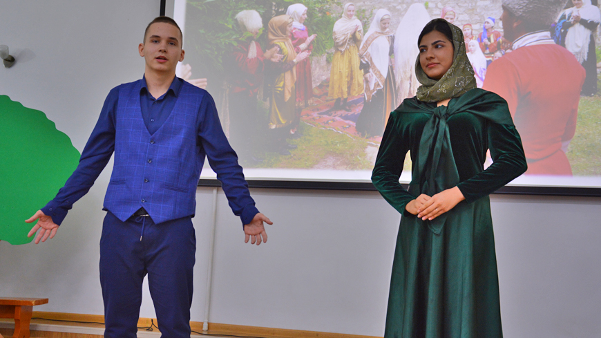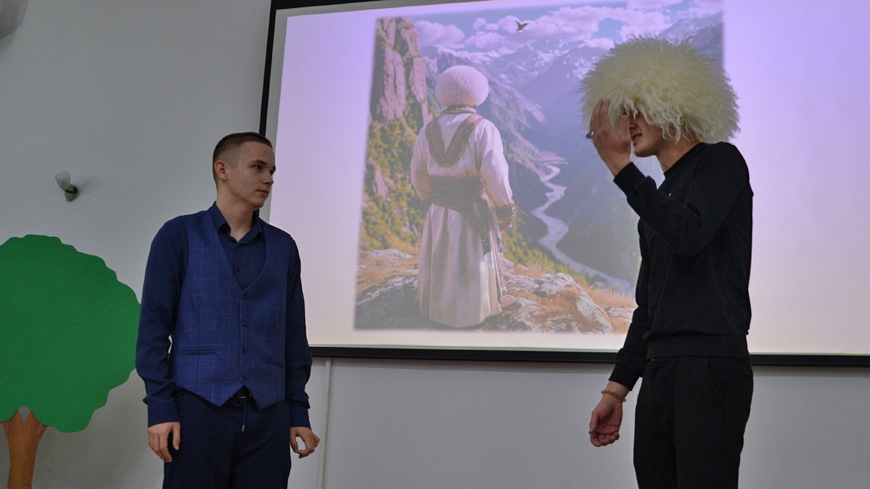 Одиннадцатиклассники выступили с ингушской «Сказкой о хорошей жене». Щедрый горец раздал нуждающимся все свои пожитки, а добрый путник вызвался исполнить любое его желание. И оно исполнилось – главный герой получил от судьбы добрую супругу, которая ценит его и любит.