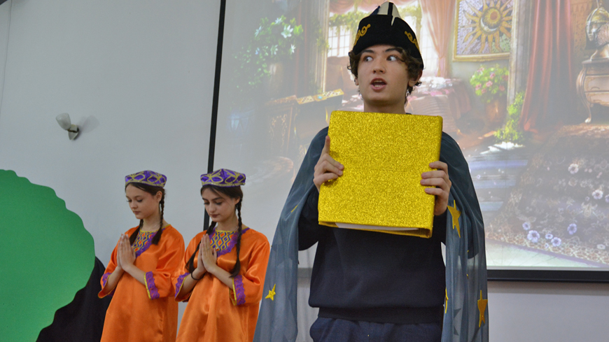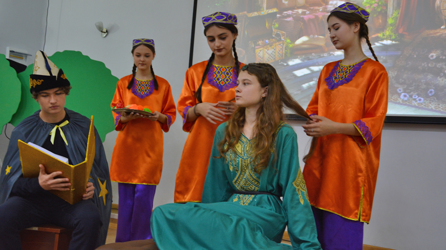 Активисты школы №9 известны своими яркими выступлениями. На сцене они выступают в роли персонажей из известных сказок. В этот раз школьники представили малоизвестные и уникальные сказки этносов нашей необъятной страны.