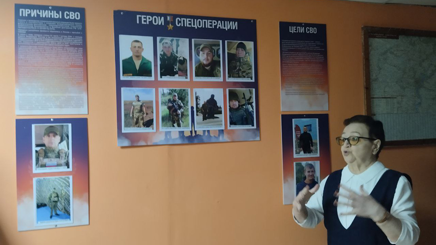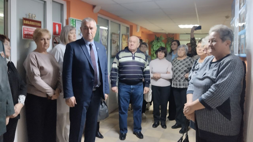 Встреча стартовала с церемонии открытия стенда «Герои спецоперации», на который занесли участников СВО — родственников сотрудников дома-интерната.
