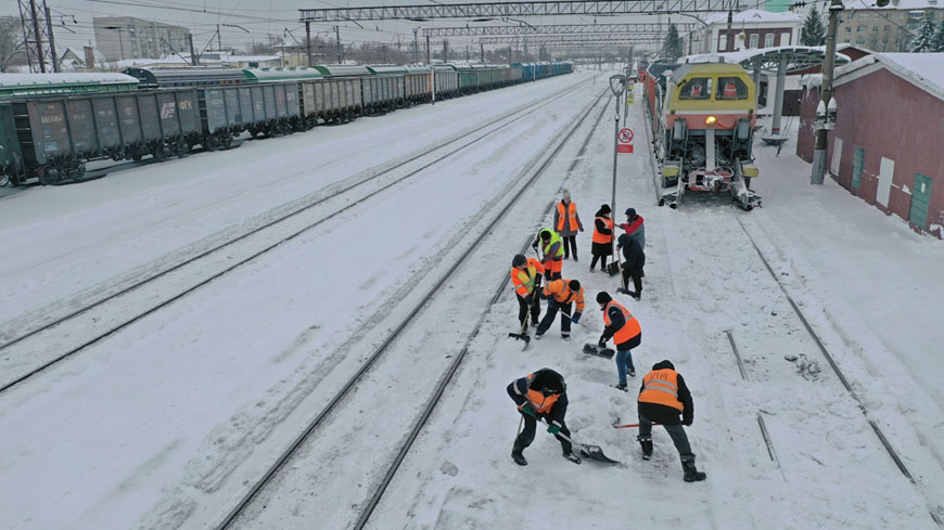 Во время снегопада приоритетной задачей железнодорожников является обеспечение бесперебойного движения грузовых и пассажирских поездов. Уборка снега ведётся как на перегонах, так и на железнодорожных станциях. От выпадающих осадков расчищаются железнодорожные пути, междупутья, стрелочные переводы и пассажирские платформы.