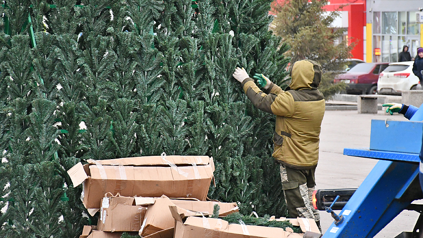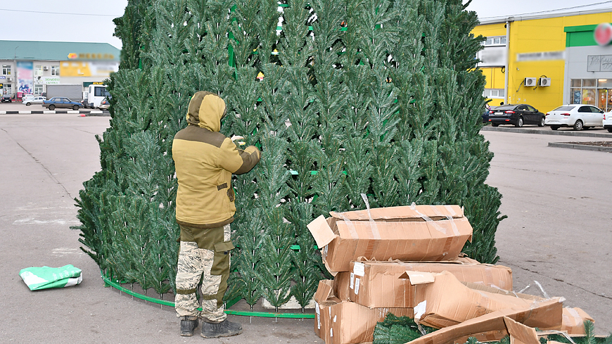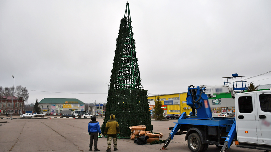 На главной площади Гагарина работники «Благоустройства» устанавливают 12-метровую новогоднюю елку. Новых украшений и гирлянд в этом году на главной городской елке не будет.
