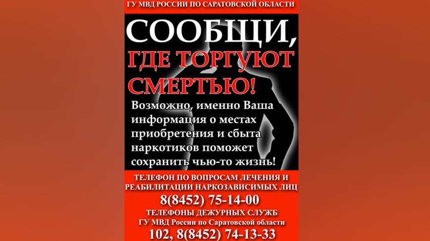 веществ жители могут оперативно сообщать по телефонам: дежурная часть ГУ МВД России по Саратовской области: 8-8452-