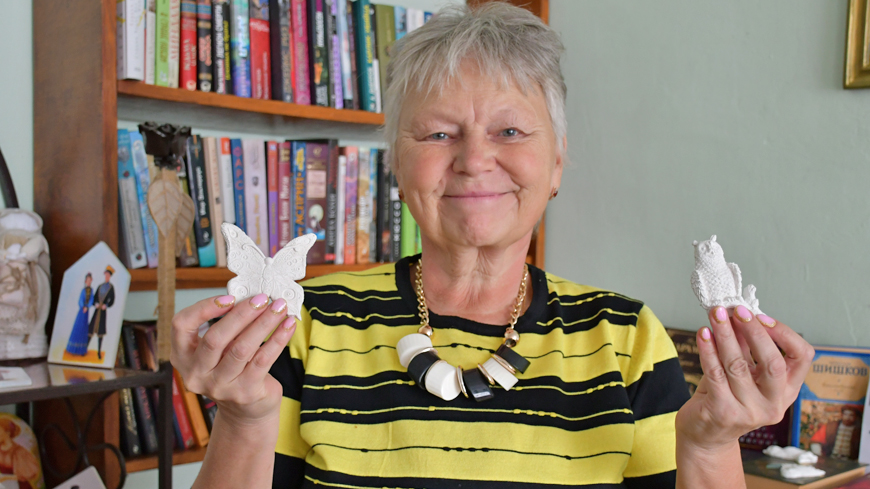 Настоящим виртуозом среди наших мастериц можно назвать Елену Орлову. В «АГ» мы рассказывали о необычном хобби Елены Владимировны, а на выставке рукодельниц она представила фигурки филинов, бабочек, кошек в технике гипсового саше.