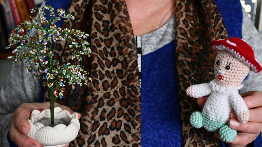 Бисероплетением и вязанием три года назад занялась Клавдия Кузнецова. До пенсии она была поваром в школьной столовой и работала в библиотеке. Среди ее поделок – очаровательный сказочный грибочек и причудливое деревце из бисера.