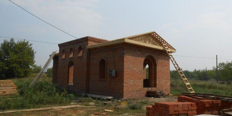 Уже неделю бригада строителей из Саратова выполняет установку несущих конструкций кровли, укладывает обрешетку.Фундамент храма был заложен несколько лет назад, в прошлом году возведены стены. Одноглавая кирпичная церковь площадью около 100 квадратных метров с уличной колокольней с тремя арками строится на пожертвования уроженцев села, проживающих в других городах и в самом селе.