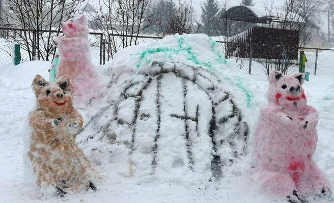Своей снежной задумкой, коллектив педагогов в шутливой форме напомнил малышам, что никогда не надо лениться, и если взялись задело, то работу надо выполнять качественно, как это сделал поросенок Наф-Наф. Выйдя на прогулку после дневного сна, дети с удовольствием поиграют с героями сказки, а родители организуют фотосессию со снежным арт-объектом.